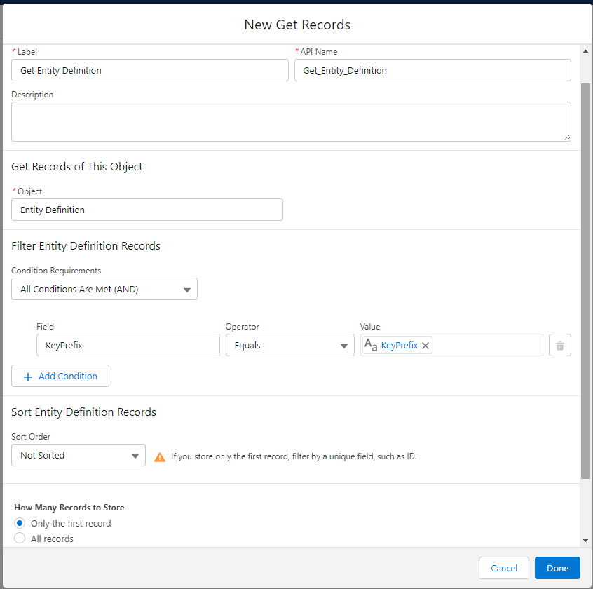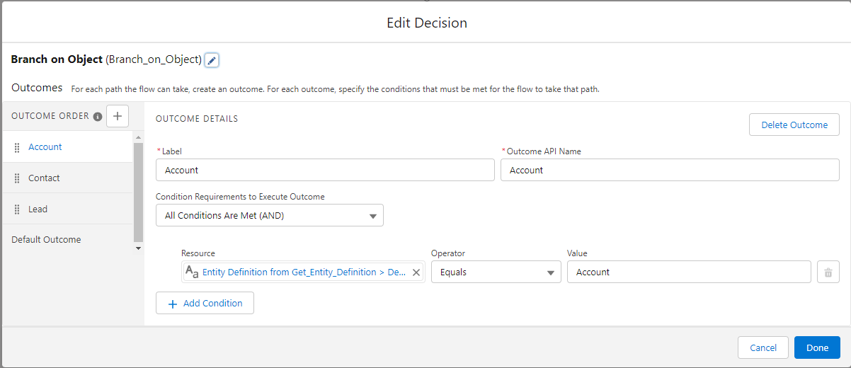 Now you can then branch off of the Entity Definition result using the DeveloperName of the object instead of creating duplicate flows for each object.